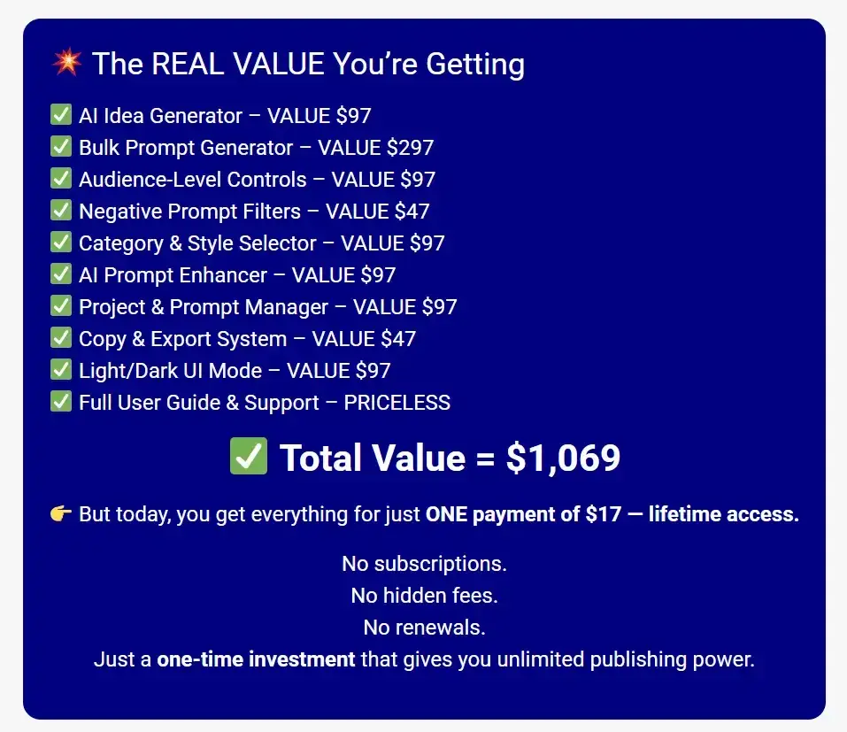 The primary offer for MerryPrompt is available at a highly affordable, one-time investment. At the time of this MerryPrompt Review, the front-end product provides the complete, lifetime-access AI Prompt Generator system with all the features outlined, plus the Full PLR License.